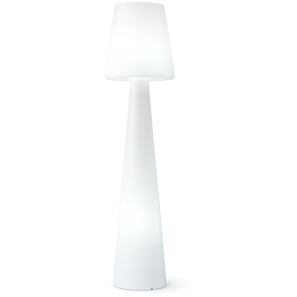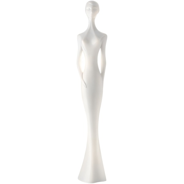 La lámpara de pie Bella con un pie de dimensiones imponentes, destaca majestuosamente con su base de estilo barroco con sus tres grandes pantallas de color blanco brillante.