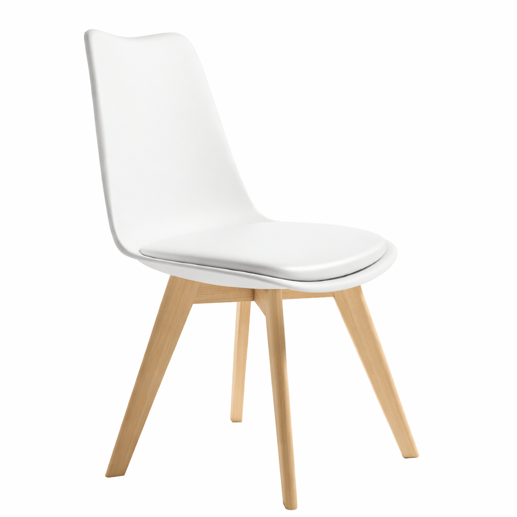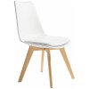 Silla Berlin en polipropileno blanco, asiento tapizado en polipiel blanca y patas en madera maciza.