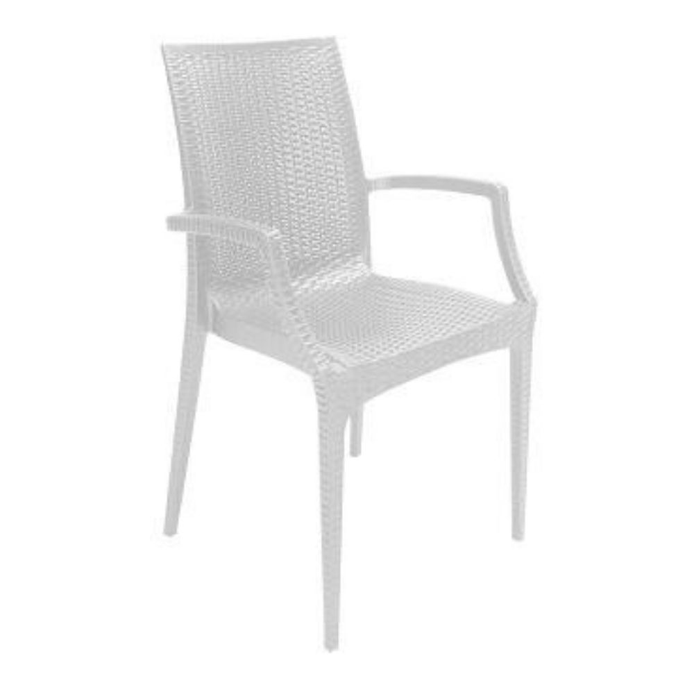 La silla con brazos Bistrot fabricada en polipropileno con efecto ratán, resulta elegante y versátil y es una buena elección para cualquier ambiente, ya que transmite equilibro entre modernidad y tradición.