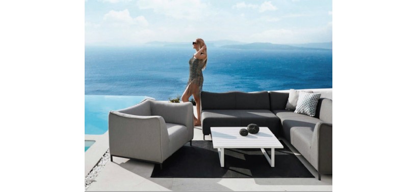 Los muebles Aluminio con tela Sunbrella son perfectos para estar a la intemperie debido a su resistencia al uso de detergentes, comodidad transpirable, resistente al moho y rayos UV, y una alta resistencia a manchas y agua. El ratán soporta muy bien el agua y los rayos ultravioletas. Y la resina aguanta la humedad sin problemas.