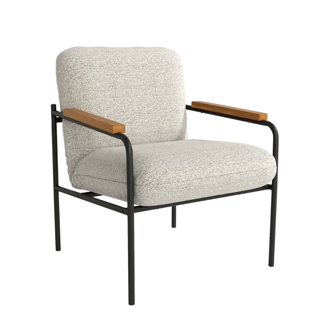 Butaca Aloe tapizada, con estructura de metal negra y reposabrazos madera.