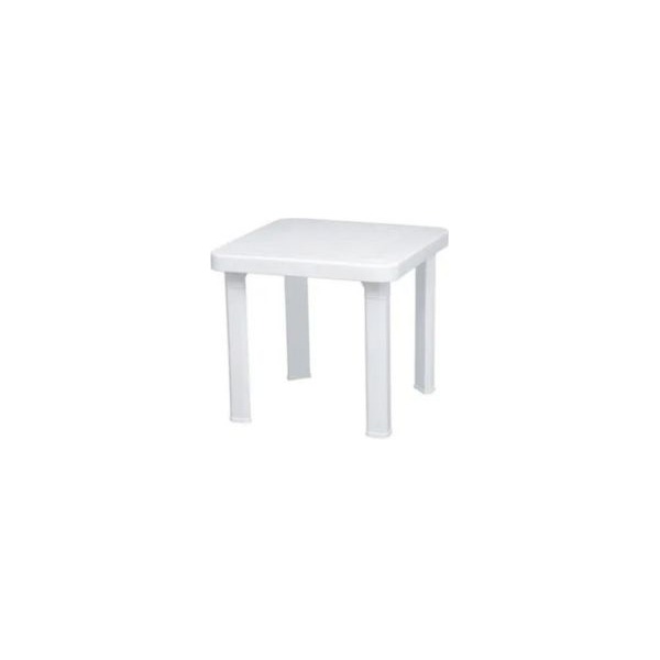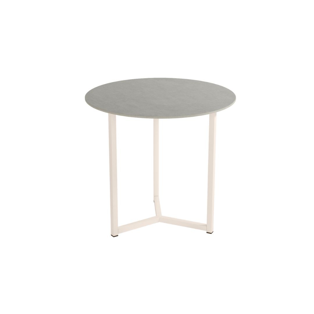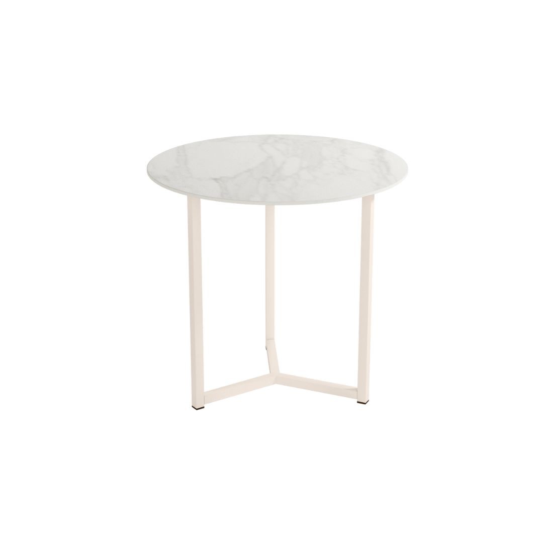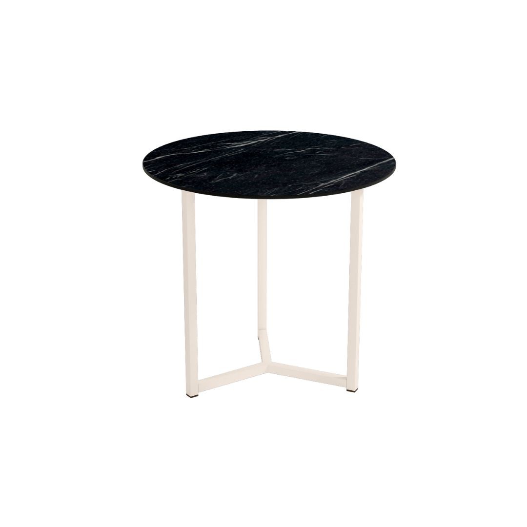 Mesa auxiliar Balear, con estructura metálica blanca y sobre porcelánico de 12 mm acabado piedras.
