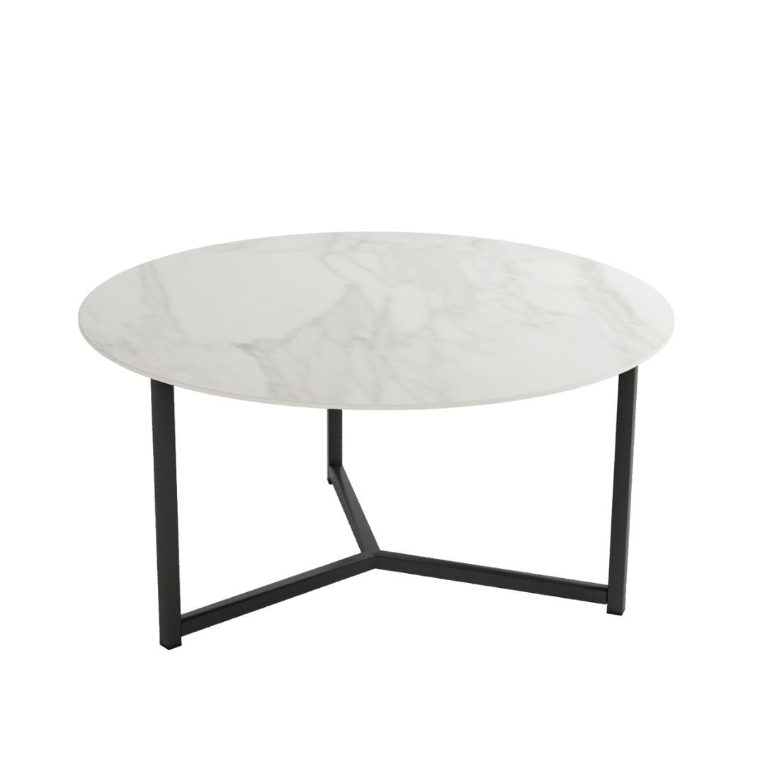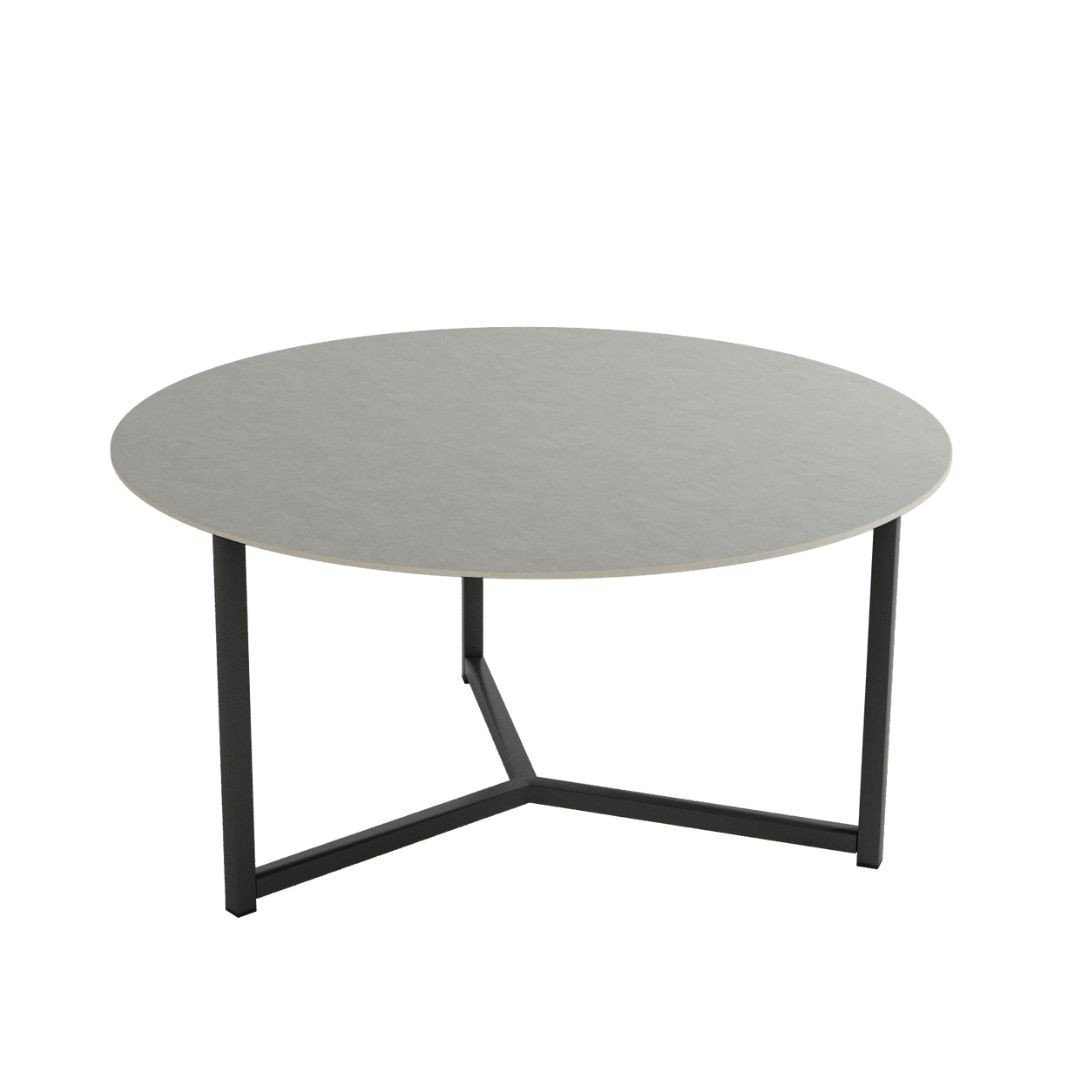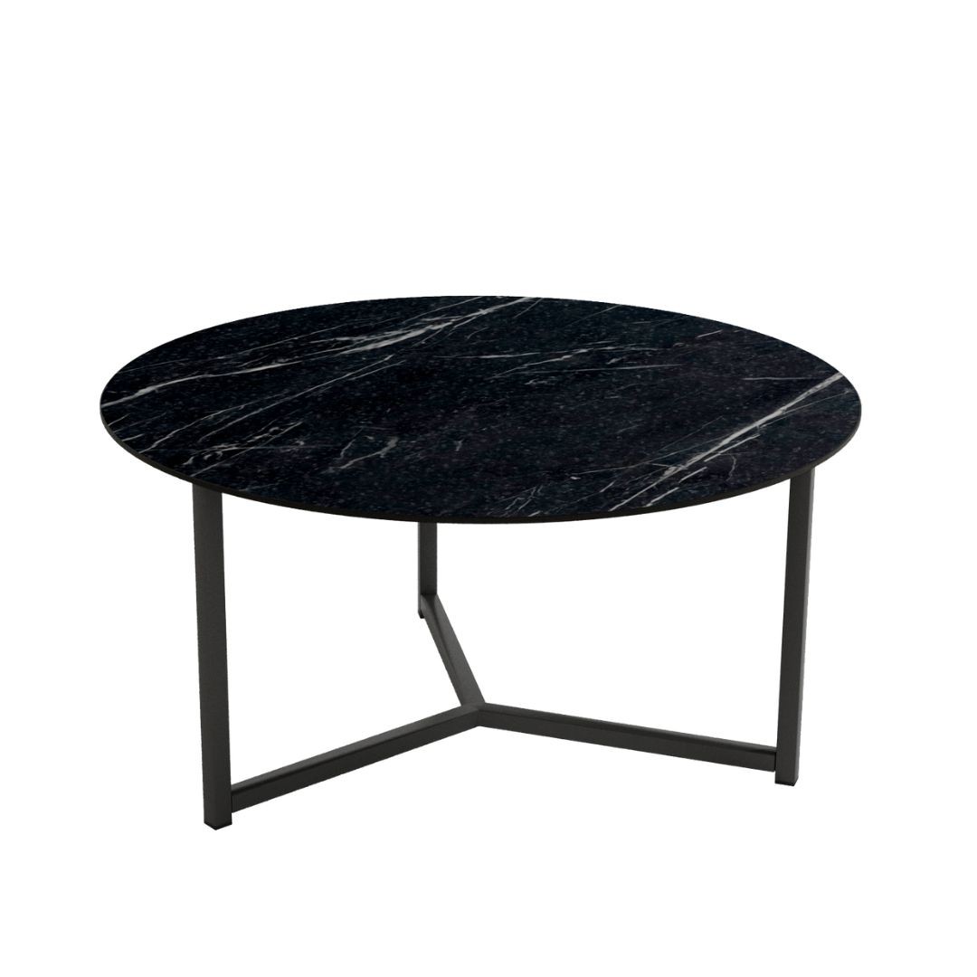 Mesa auxiliar Balear, con estructura metálica negra y sobre porcelánico de 12 mm en acabado piedras.