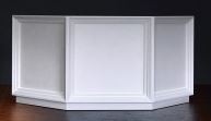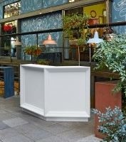 Barra para Bar, Pub etc mod. Nilo. Estructura en poleasy rotacional. Compuesta con un módulo frotal y dos esquineros. Las formas se inspiran en las barras de bar de los antiguos pubs irlandeses. Uso contract en bares, restaurantes, terrazas, recepciones para interiores y exteriores. Los lados se puede cerrar con el modulo frontal, el plano es rotacional con panel HPL integrado y se puede personalizar la fachada.