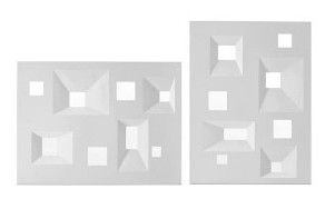 Biombo mod. Frames. Utilizado para separador de espacios. opción en vertical y en horizontal. Compuesto de superficies abocinadas que hacen de marco para las pequeñas ventanas, poniéndose en agradables escorzos geométricos. Se puede utilizar independientemente con lastres adecuados para la instalación o con estructuras metálicas para una buena fijación al suelo. Uso para interiores y exteriores.