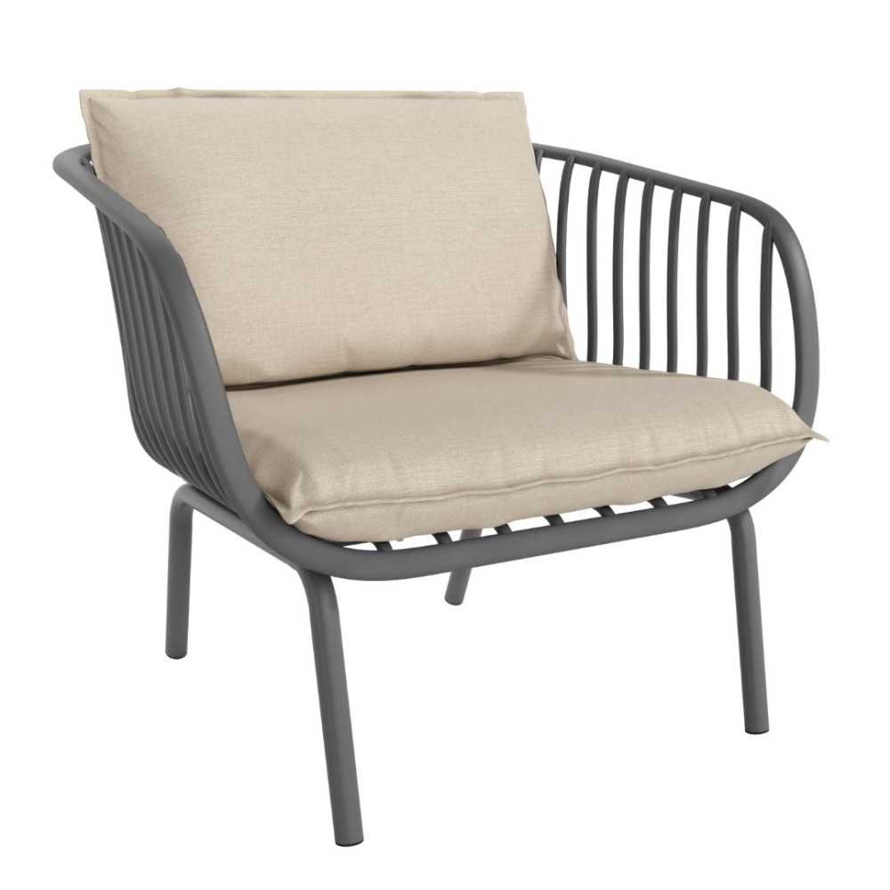 La butaca Aruba de 1 plaza en polipropileno y metal grafito con cojines en beige, es un diseño que combina materiales resistentes con comodidad y estilo.