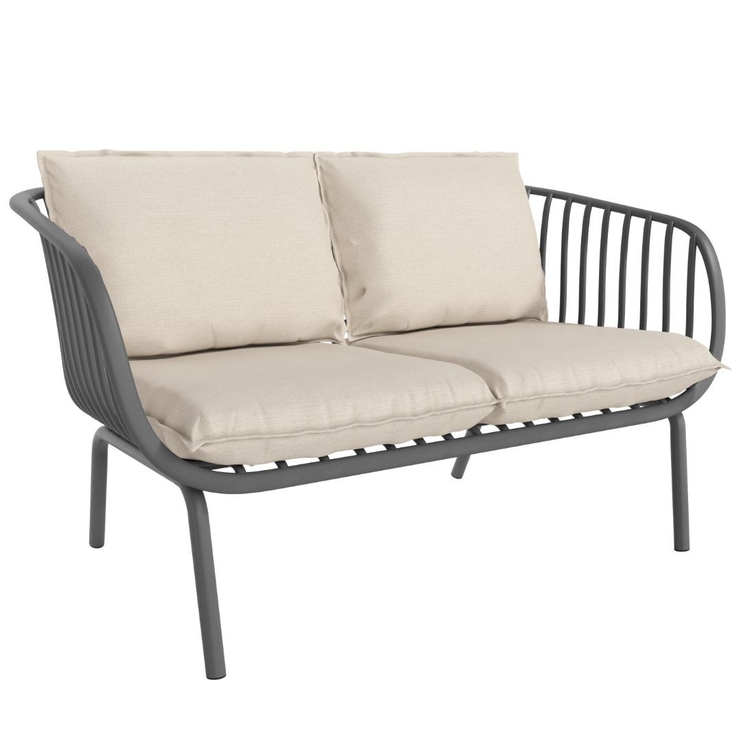 La butaca Aruba de 2 plaza en polipropileno y metal grafito con cojines en beige, es un diseño que combina materiales resistentes con comodidad y estilo.