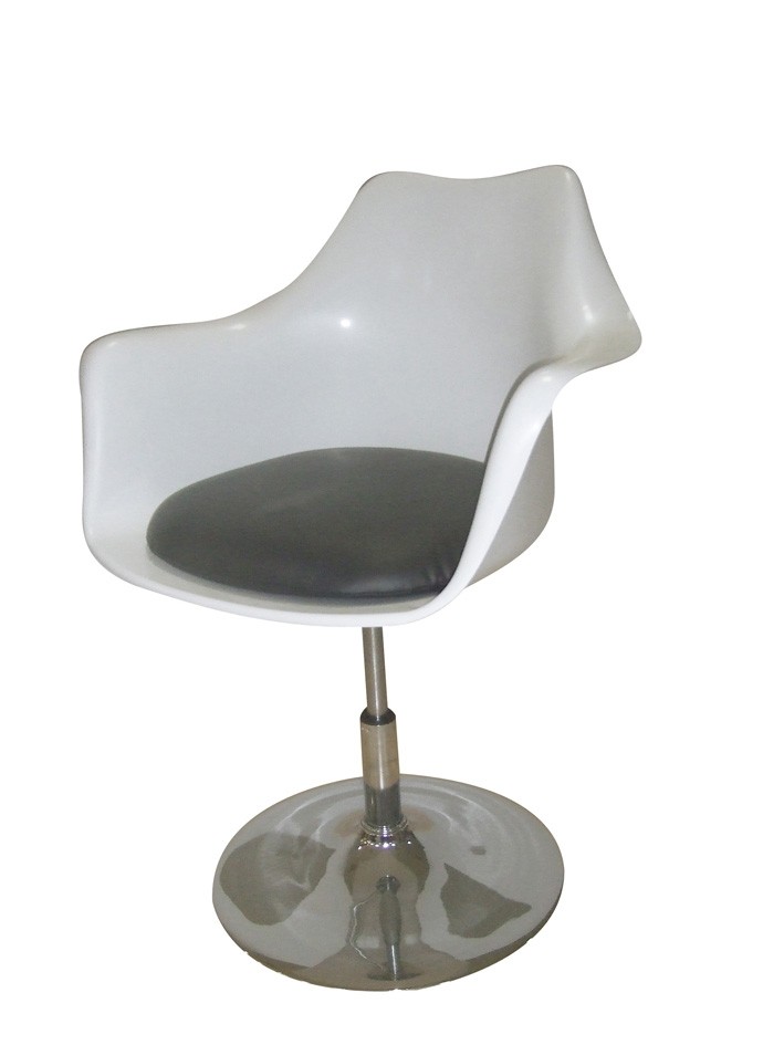 Dicha butaca, se sostiene mediante una base redonda con pie central en acero cromado.