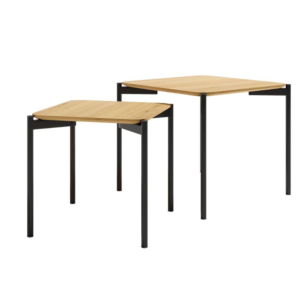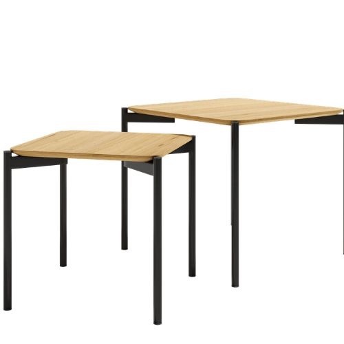 Conjunto de dos mesas Java cuadradas con tablero de roble y pata en metal negro.
