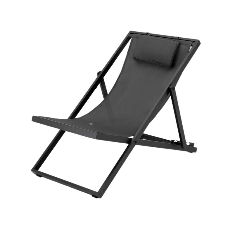 La hamaca modelo Tika, fabricada en estructura de aluminio color antracita, respaldo y asiento en textilene en antracita es perfecta para usar en piscinas o playas de hotel.