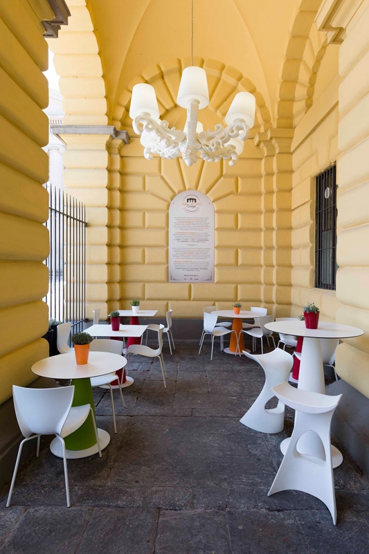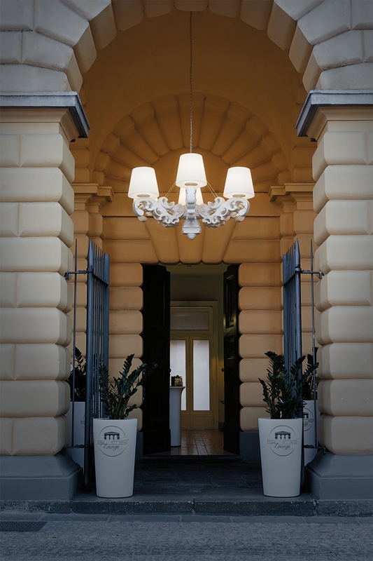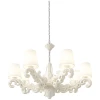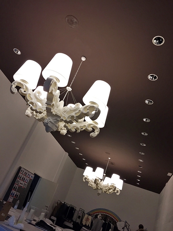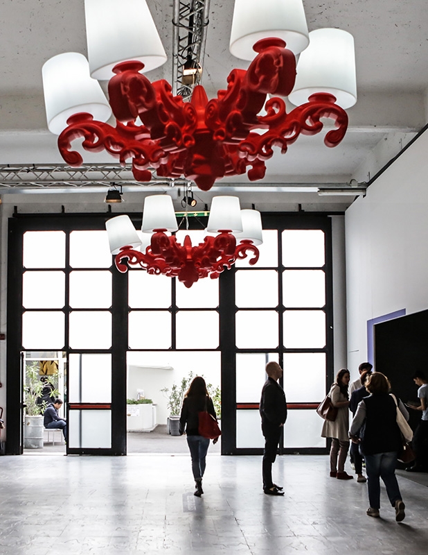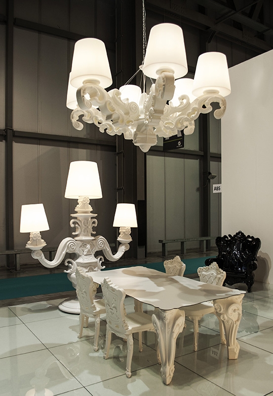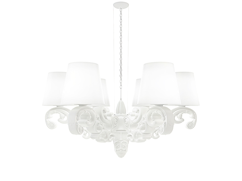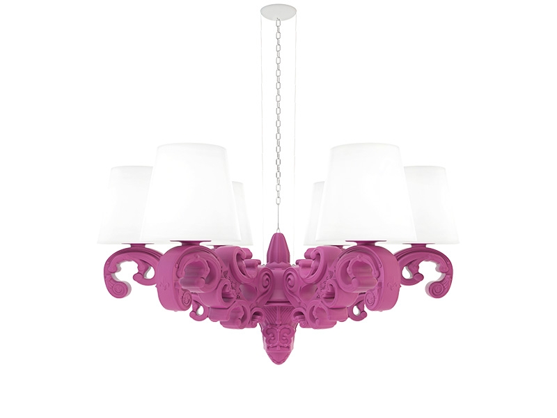 Esta lámpara de suspensión también reúne la riqueza de los detalles propios del estilo barroco y la ironía y el espíritu pop de los muebles de polietileno.