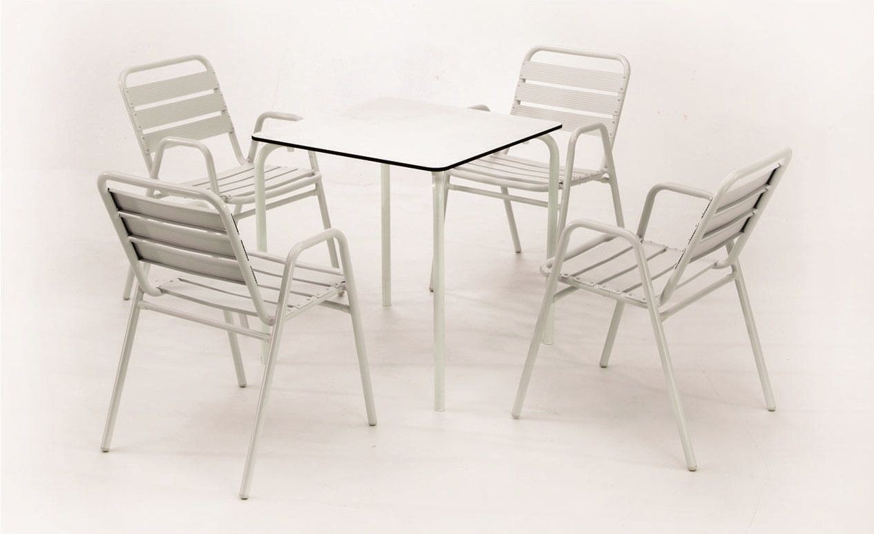 La mesa Acra está fabricada con patas en acero galvanizado en color blanco o gris antracita y tablero en compacto plus blanco o gris antracita.