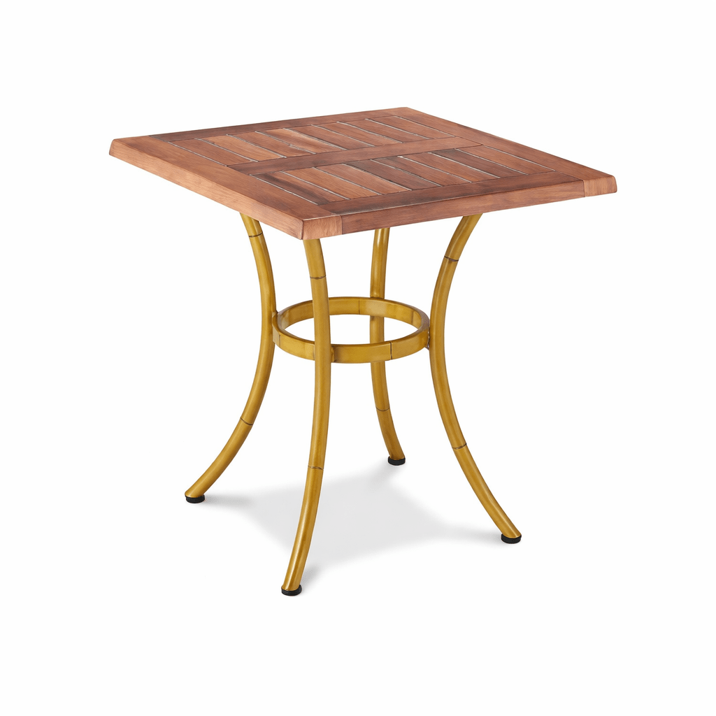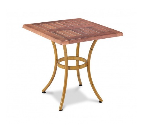La mesa Canterbury fabricada con pie en aluminio y tablero de teca, es ideal para bares y restaurantes que quieran dar un toque antiguo.