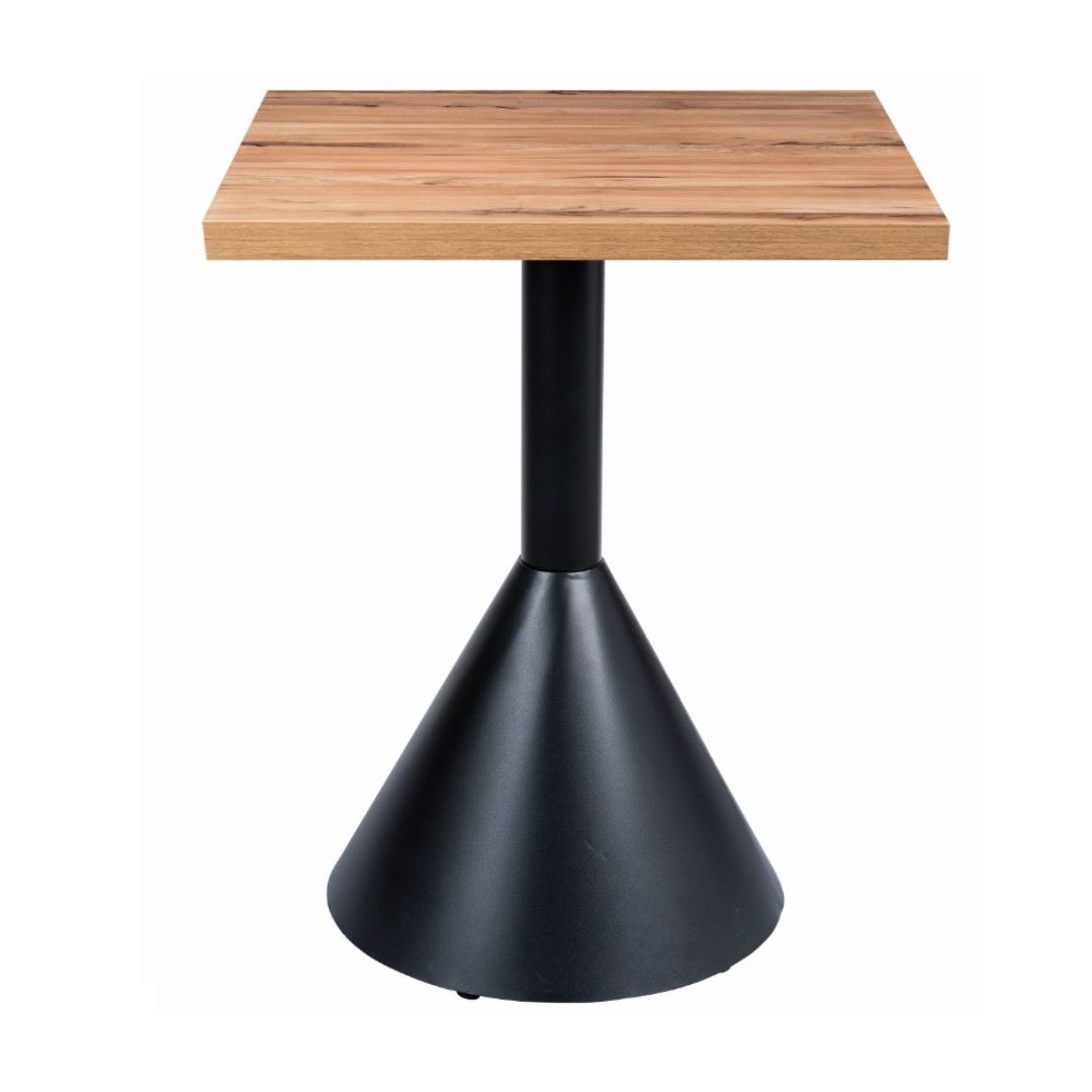 La mesa cuadrada Columbia esta formada por un pie central con tubo redondo y base cónica en acero pintado negro y un tablero en melamina de 60 x 60 cm en color roble atlas.