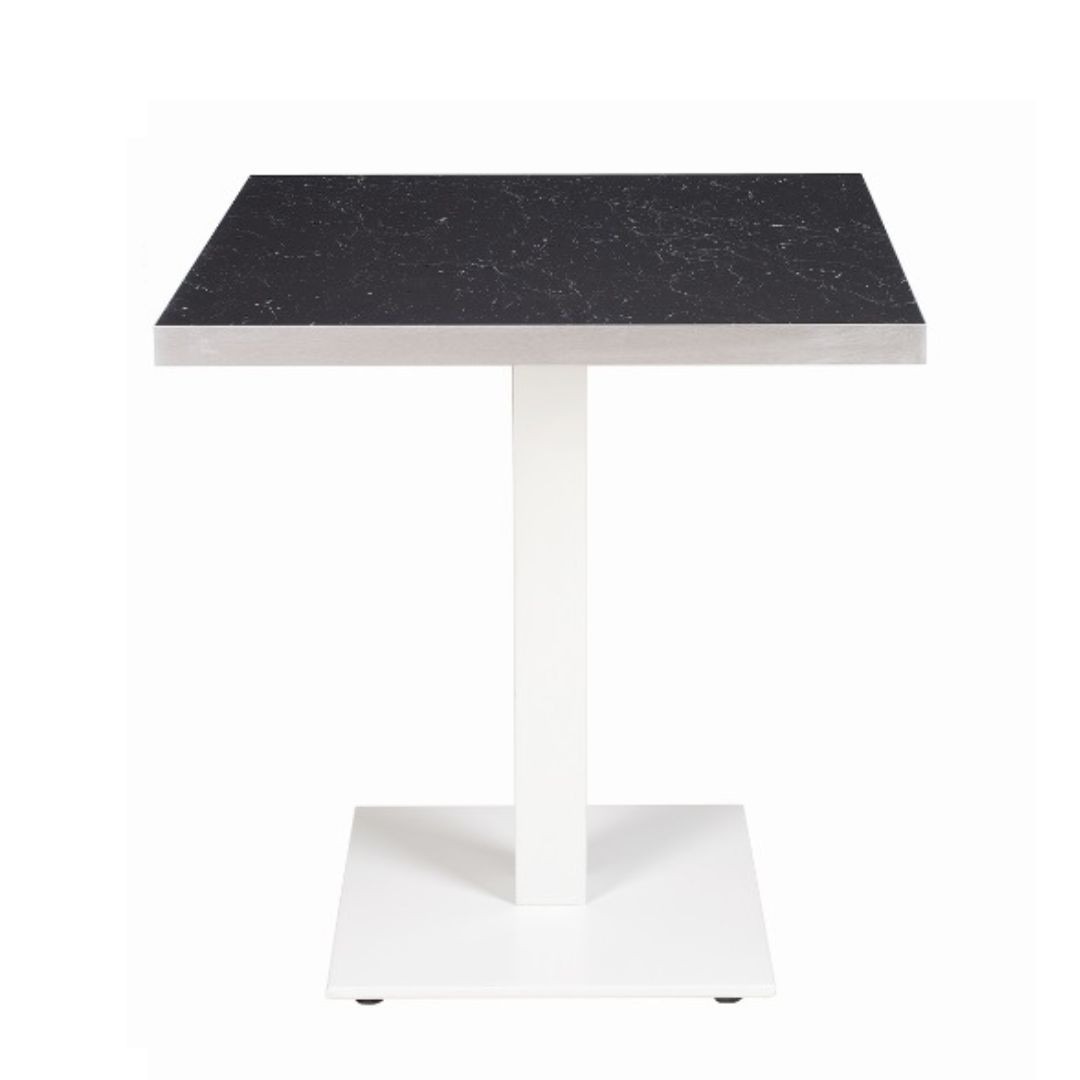 La mesa Munich esta formada por un pie central con base cuadrada en aluminio pintado blanco y un tablero en melamina de 70×70 cm en color zeus negro.