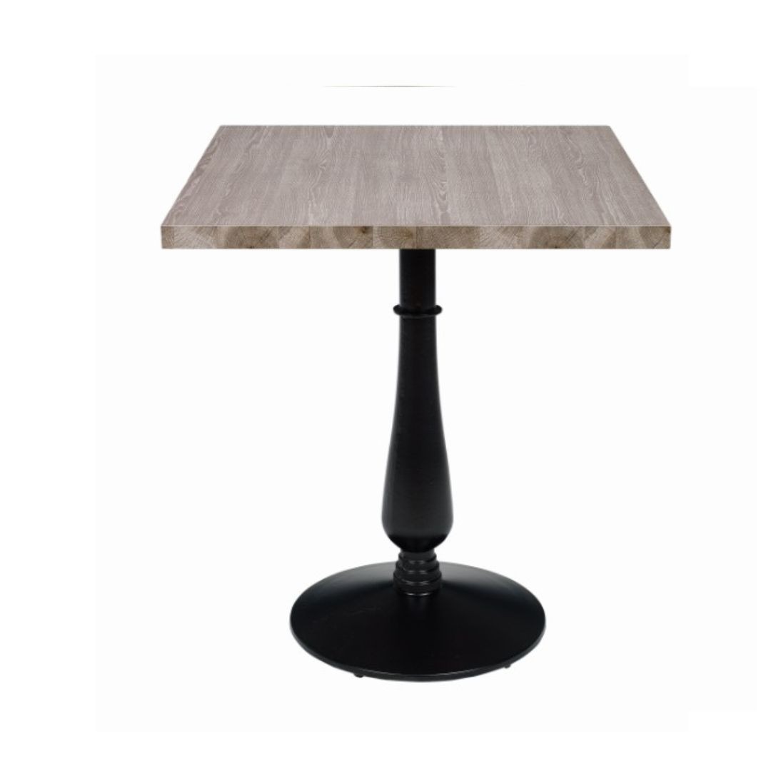 La mesa cuadrada Opera esta formada por un pie central torneado en acero pintado negro y un tablero en melamina de 70×70 cm en color roble joplin.