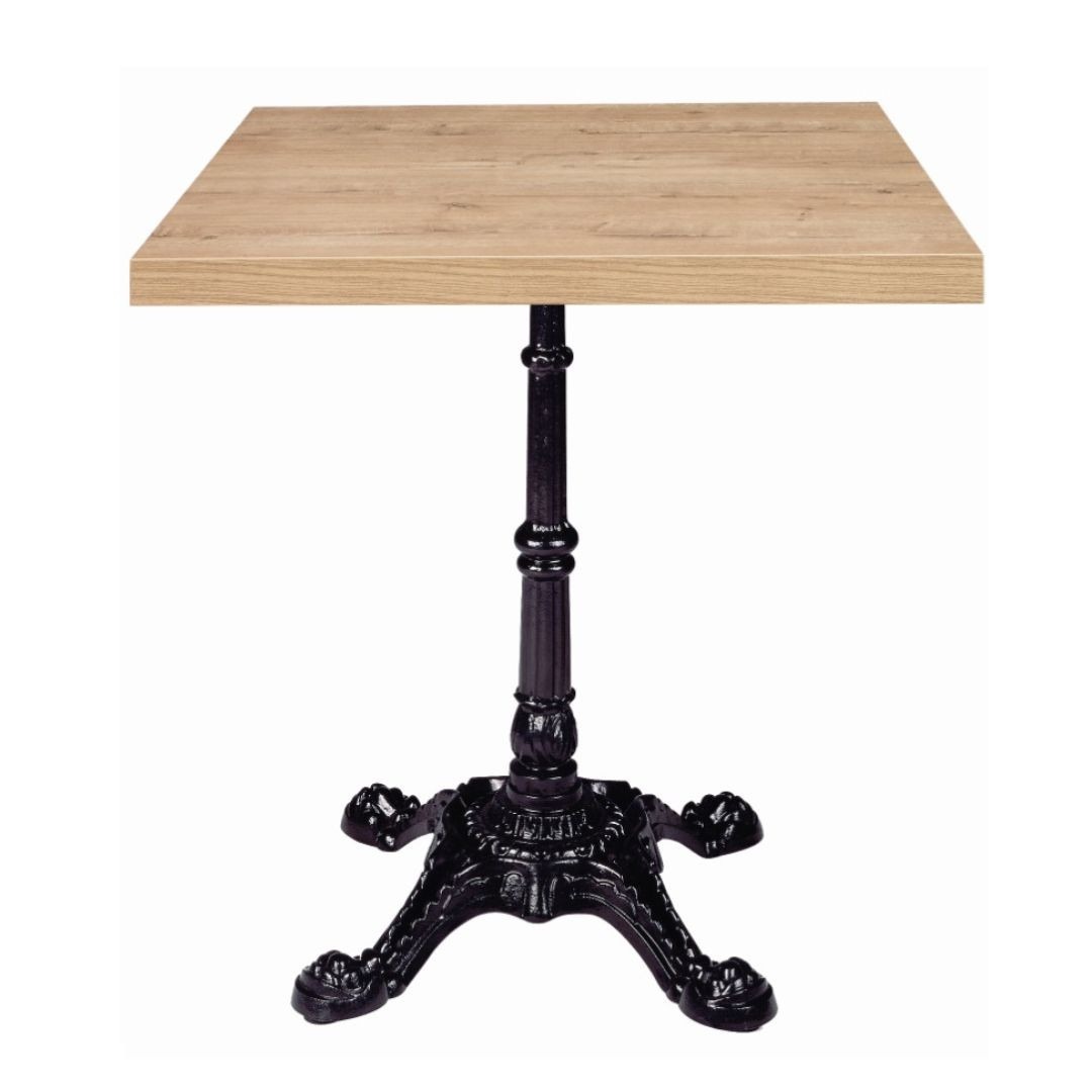 La mesa cuadrada Paris esta formada por un pie central de estilo parisino acabado en cuatro puntas en acero pintado negro y un tablero en melamina de 70×70 cm en color roble atlas.
