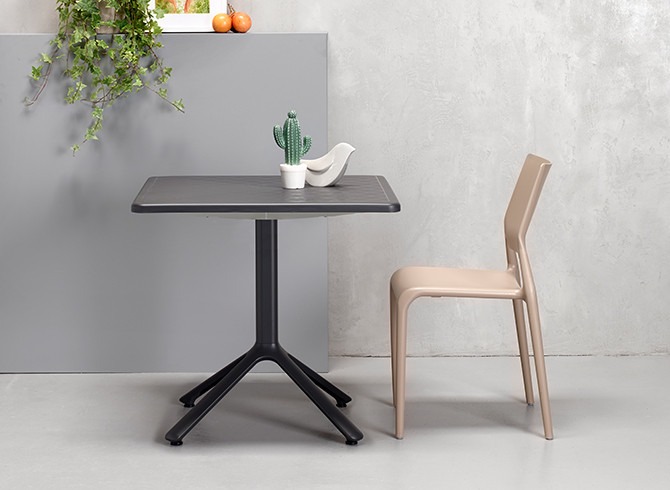 La mesa Eco fabricada en tecnopolímero y aluminio con un sistema de plegado muy fácil, es ideal para bares y restaurantes que no dispongan de metros ya que se pueden alinear varias mesas, ahorrando así el máximo de espacio. Por ello, es una mesa ligera y fácil de transportar.