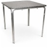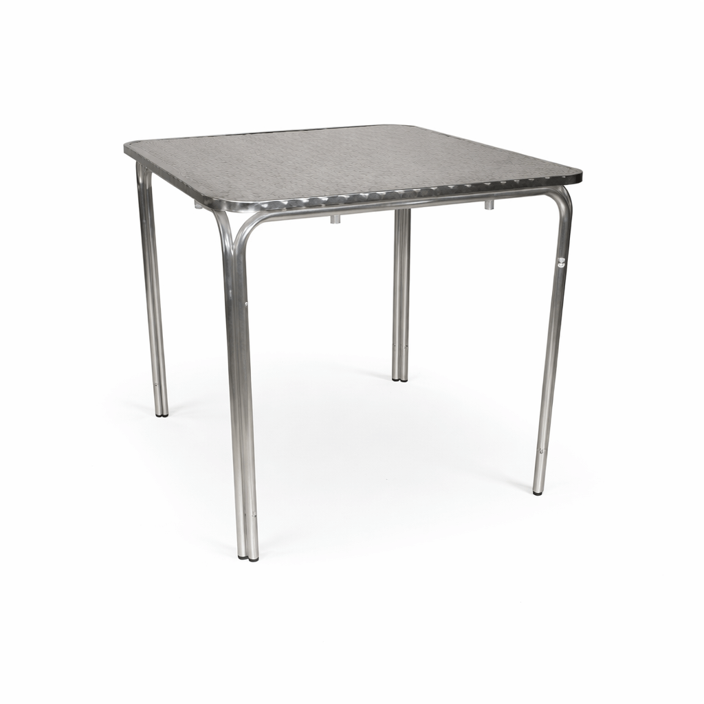 La mesa Four está fabricada con patas con doble tubo de aluminio de ø25 y tablero en acero inoxidable adamascado y repulsado.