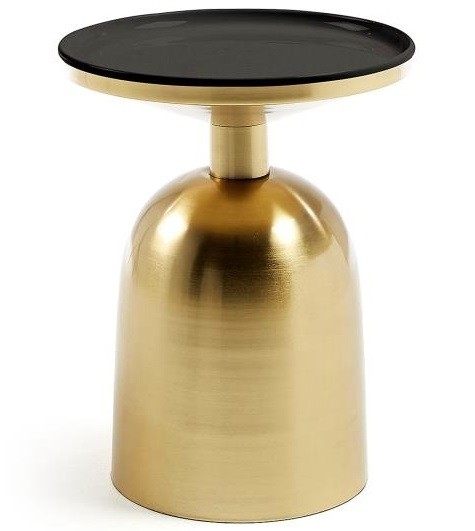 La mesa auxiliar Gold tiene una lámina de acero con un acabado dorado y sobre de esmalte negro.