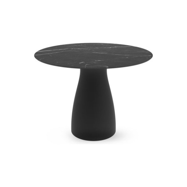 Mesa de terraza con estructura y sobre de lamas metálico.