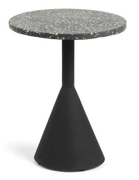 La mesa auxiliar Melani tiene el sobre en piedra natural de terrazo y pie metal negro