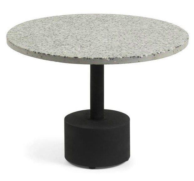 La mesa auxiliar Mint tiene el sobre en piedra natural de terrazo y pie metal negro