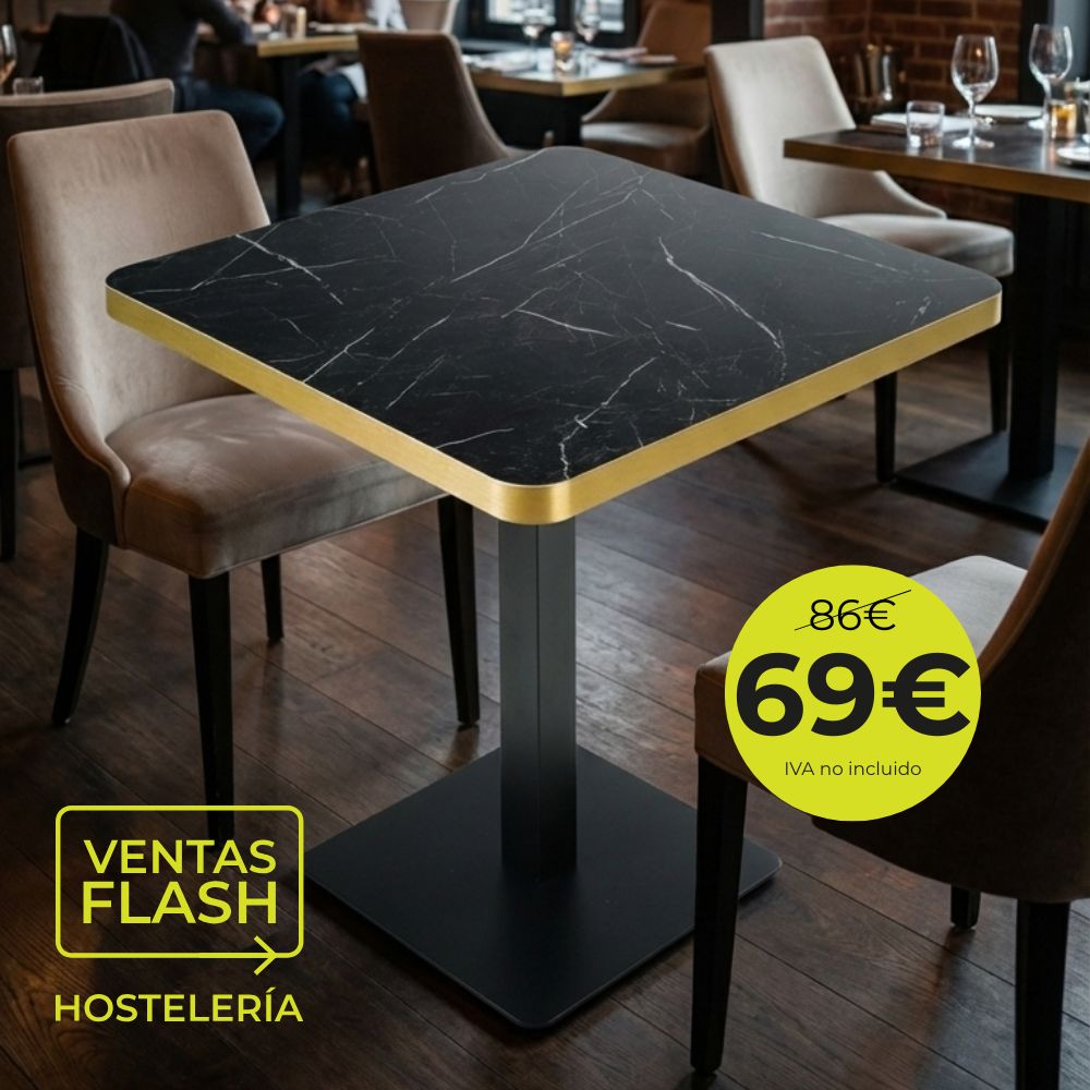 Mesa Olympo pie de hierro negro y tablero simil marmol negro con remate dorado Horeca