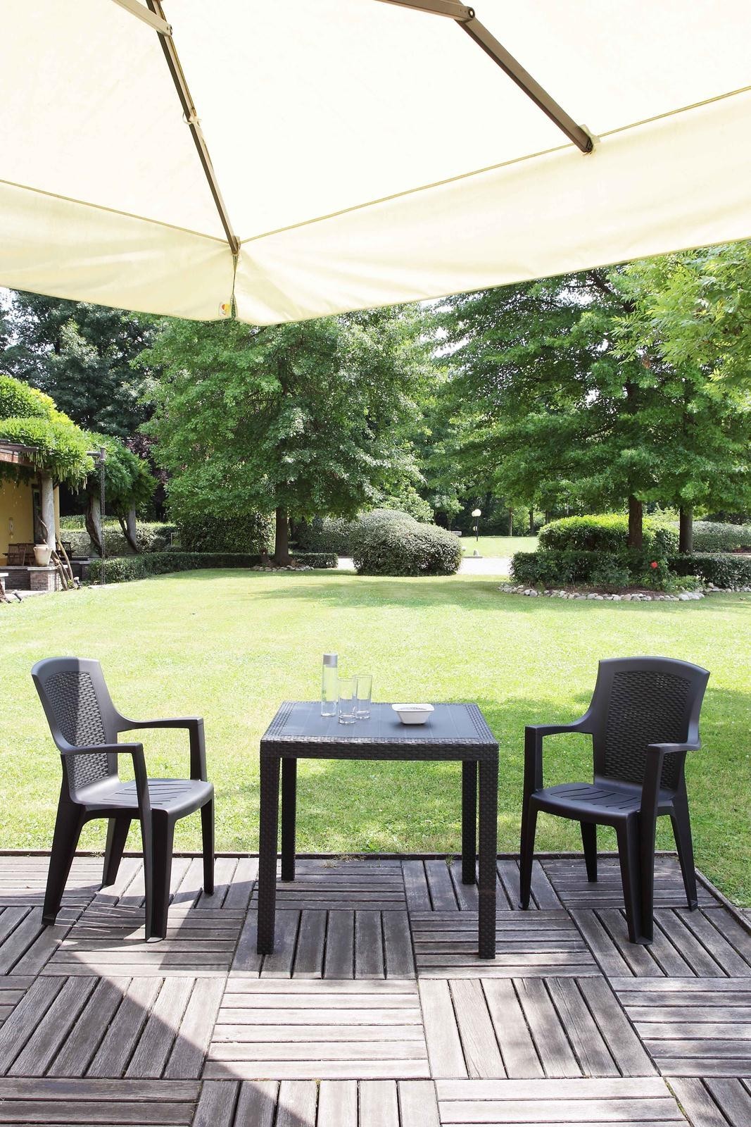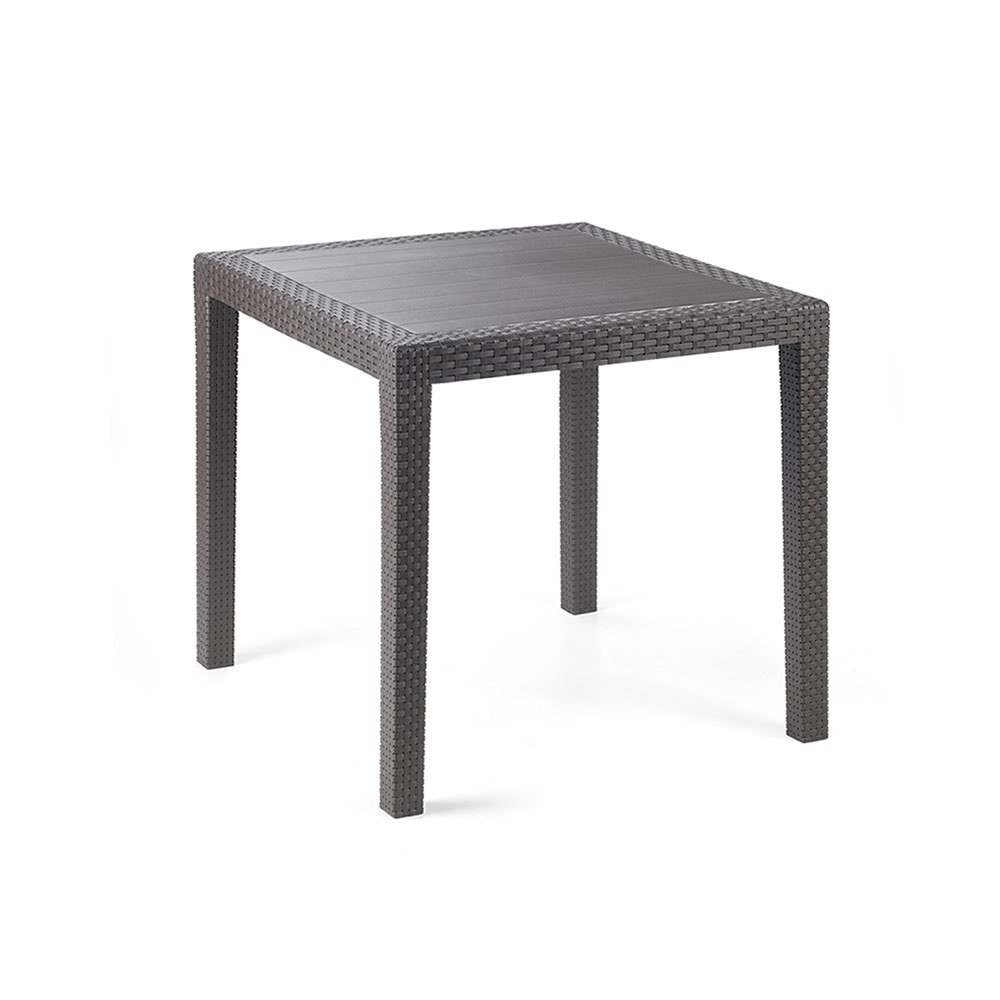 Está fabricada en polipropileno, material resistente ideal para interior o exterior, que no precisa de ningún mantenimiento, con las patas y borde de la mesa adornado con una textura símil ratán.