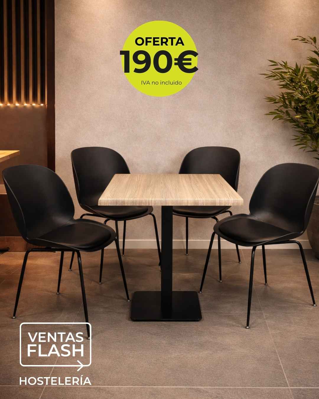 Mesa con pie hierro negro y tablero en melamina roble de 70×70 cm + 4 sillas para Horeca o contract.