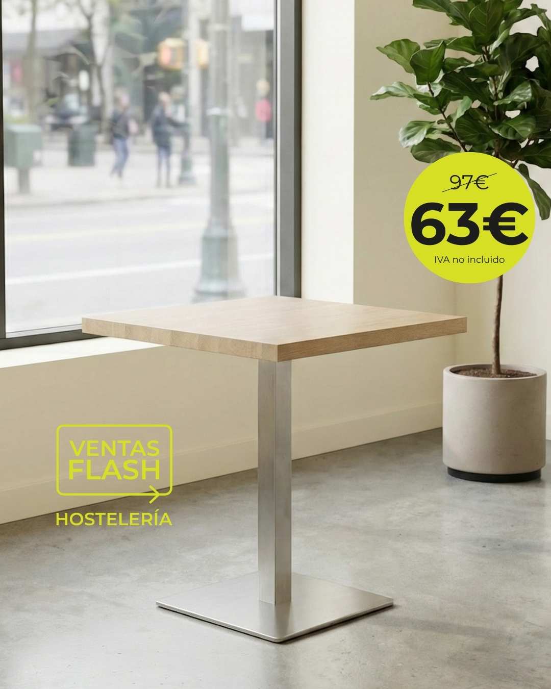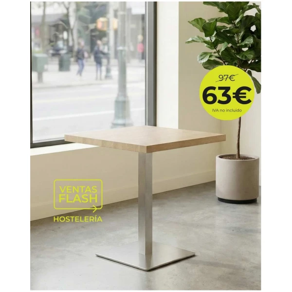 Mesa con pie inoxidable y tablero Werzalit claro de 70×70 cm para Horeca o contract.