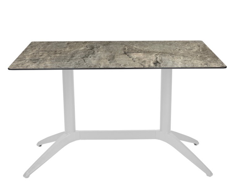 Mesa Quatro Dúo de Ezpeleta fabricada en aluminio pintado en blanco y tablero en compacto color stone.