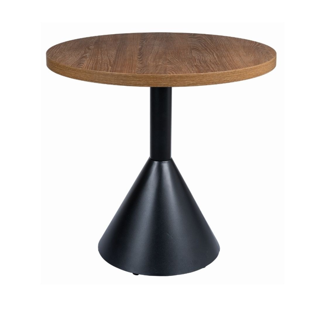 La mesa redonda Columbia esta formada por un pie central con tubo redondo y base cónica en acero pintado negro y un tablero en werzalit de ø70 cm.