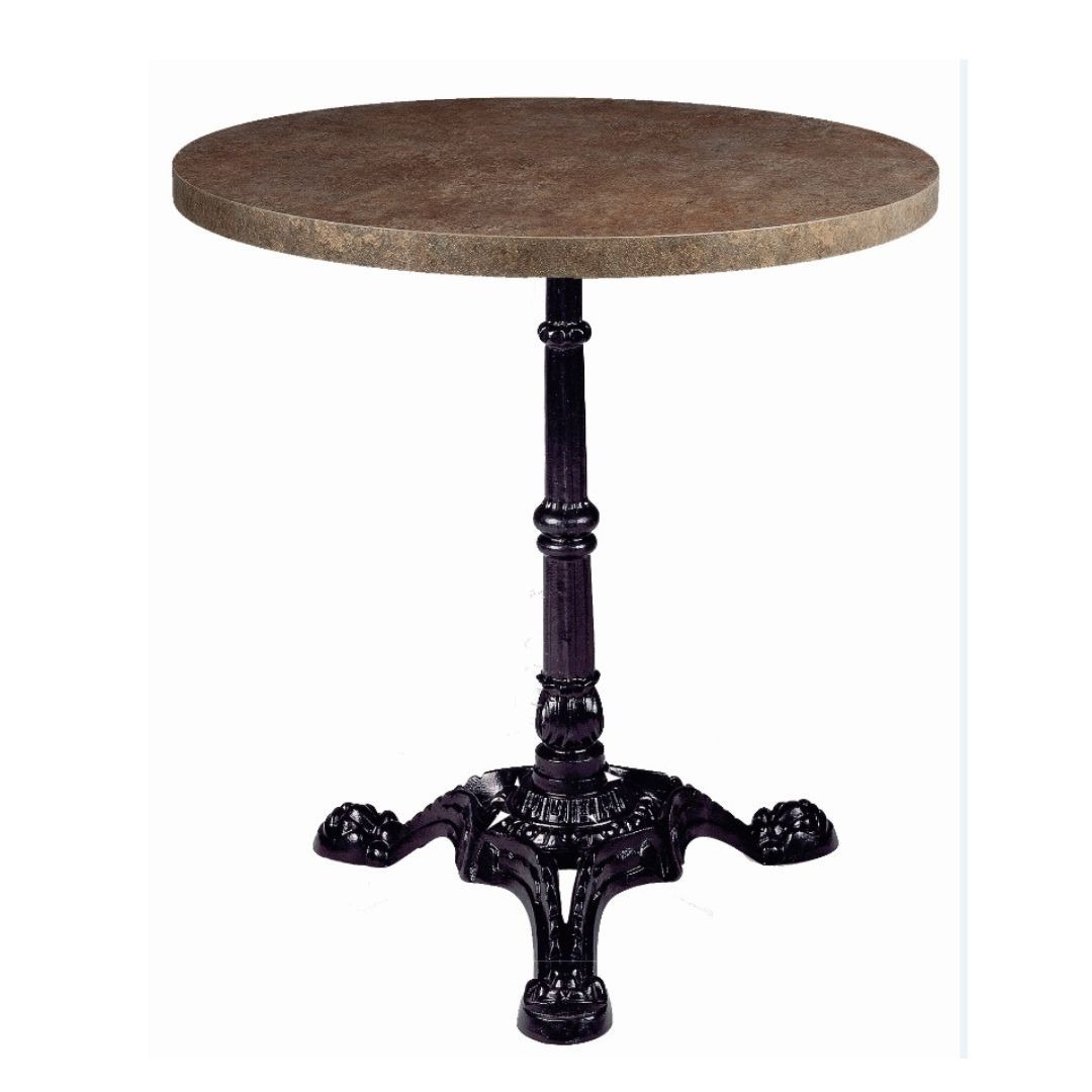 La mesa redonda París esta formada por un pie central de estilo parisino acabado en tres puntas en acero pintado negro y un tablero en werzalit ø70 cm en color bronce.