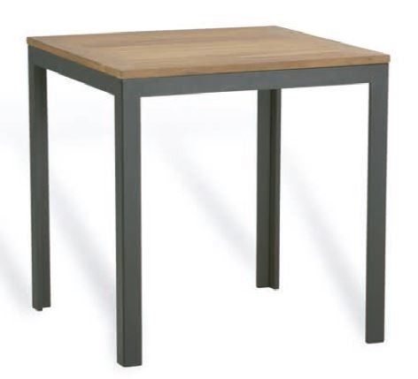 La mesa Teka está fabricada las patas en aluminio lacado en color antracita o plata y tablero en madera de teka.