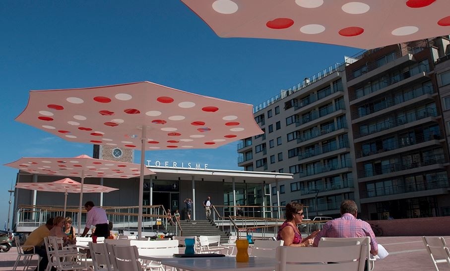 Parasol modelo Dote con un diámetro de 300cm, estructura en aluminio anonizado y cubierta de poliéster, muy adecuado para exteriores como terrazas, restauración, cafeterías. Diseño muy actual, creativo, vistoso y moderno de fácil limpieza. Interior diseñado con dos lienzos de diferentes colores con un patrón de contraste de agujeros. El cambio de posición del sol y los agujeros existentes en el parasol se asegura de que los puntos de luz en la pantalla inferior varíen de posición; esto lo convierte en un animado espectáculo de luz. Para uso contract y hostelería.