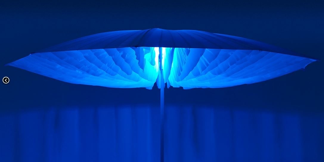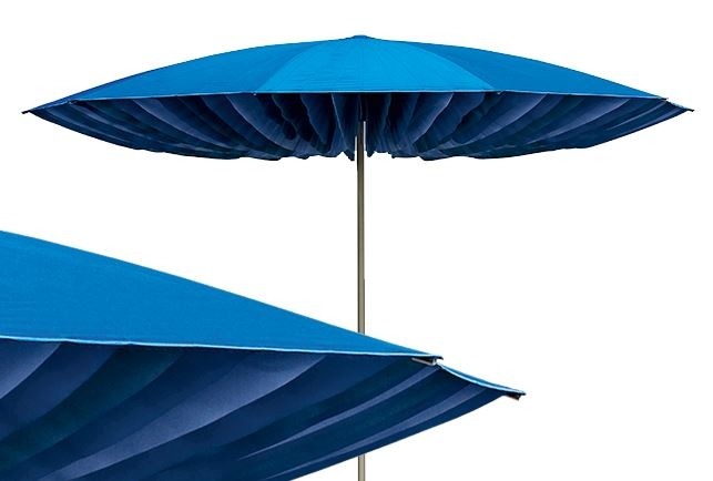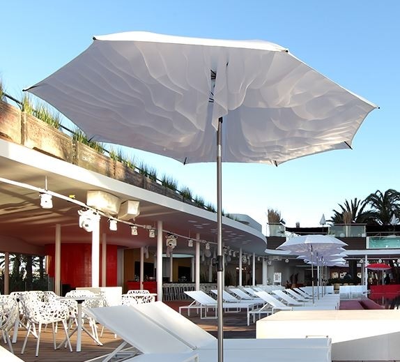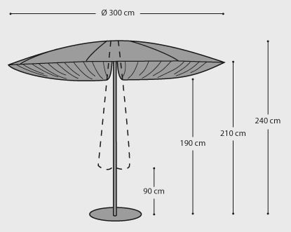 Parasol modelo Palmira con un diámetro de 300cm, estructura en acero inoxidable y cubierta de poliéster, muy adecuado para exteriores como terrazas, restauración, cafeterías. Diseñado con lamas imitando las de las setas. Diseño muy actual, creativo, vistoso y moderno de fácil limpieza. Para uso contract y hostelería.