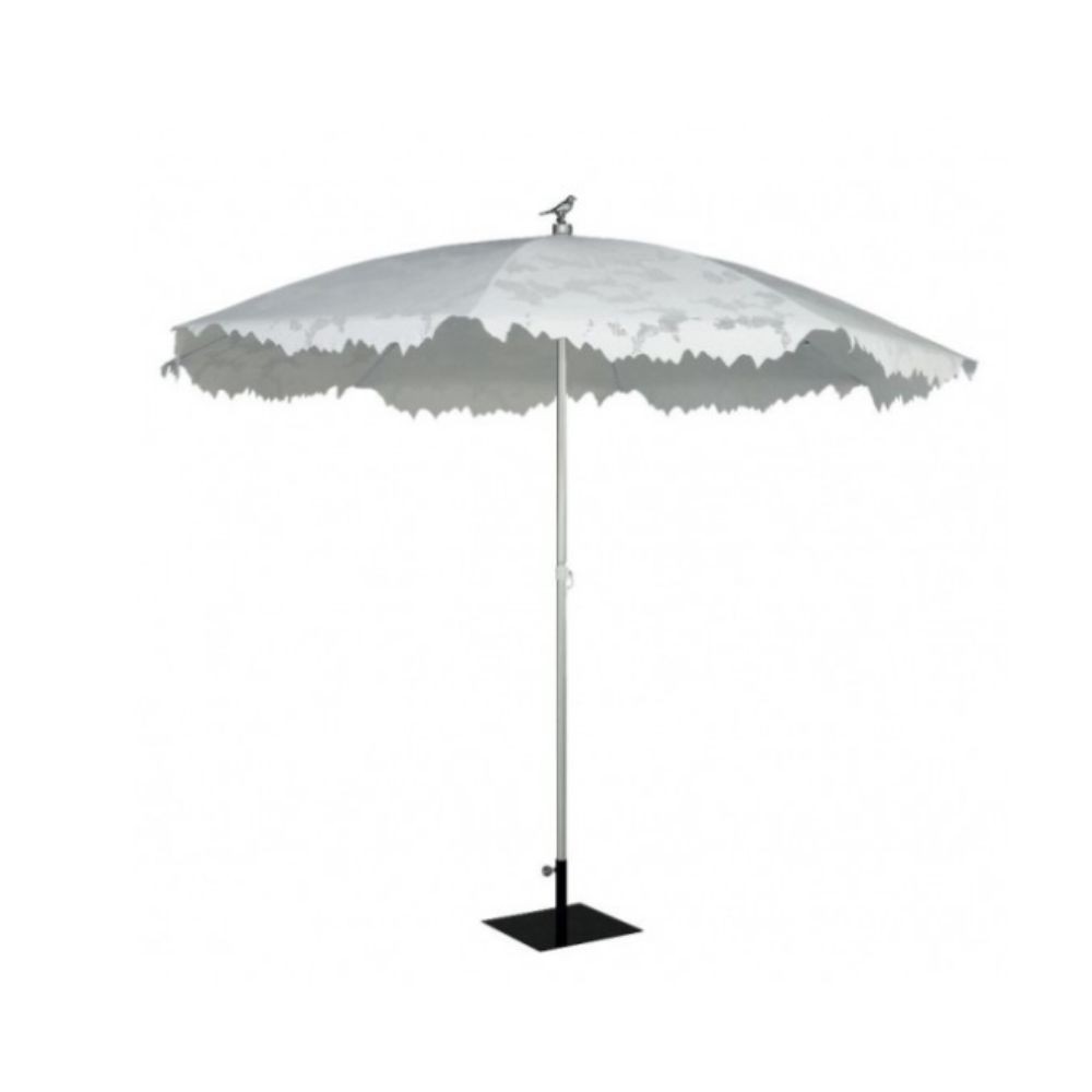Parasol modelo Sandino con un diámetro de 350cm, estructura en aluminio anodizado y cubierta de poliéster. muy adecuado para exteriores como terrazas, restauración, cafeterías. Diseño hermoso que parece un dosel, crea un juego de luces y sombras en el espacio ubicado. El encaje especialmente diseñado crea la ilusión de un lugar idílico rodeado de naturaleza. Diseño muy actual, creativo, vistoso y moderno de fácil limpieza. Para uso contract y hostelería.