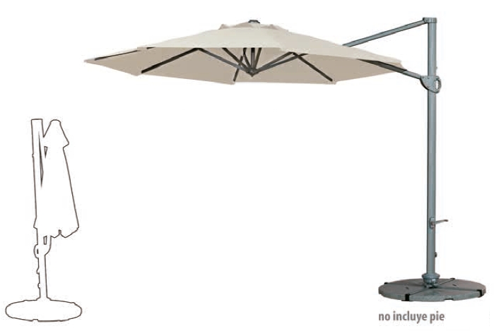 Está fabricado con estructura metálica en color gris, la sombrilla reforzada mediante 8 varillas en aluminio, además, el mecanismo está preparado para poder girarlo 360º, de forma que nos permita usarlo en diferentes posiciones protegiendo mejor las mesas de hostelería.