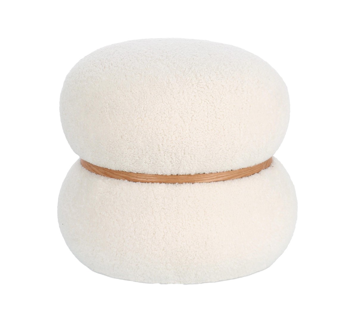 Pouf Mirka en blanco, con efecto lana y anillo central decorativo de estilo contemporáneo.