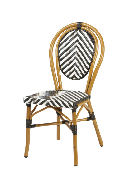 Silla fabricada con armazón de aluminio plastificado y médula sintética 100% virgen en dos colores blanco y negro con un estilo que imita a los bares de París, es ideal para espacios interiores y exteriores, es muy usada en bares y restaurantes por su confort, diseño y resistencia.