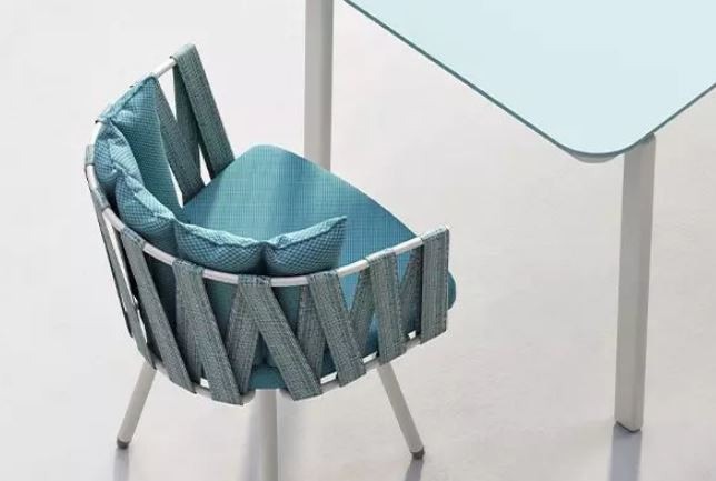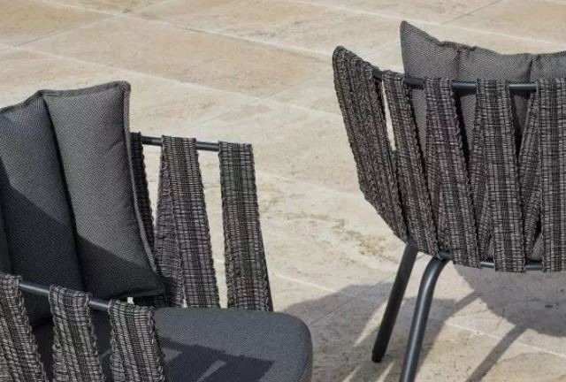 Cojines y tapizados idóneos para el exterior. Respaldo en cinta de pasamanería trenzada sobre tubo de aluminio. Protección U.V.
