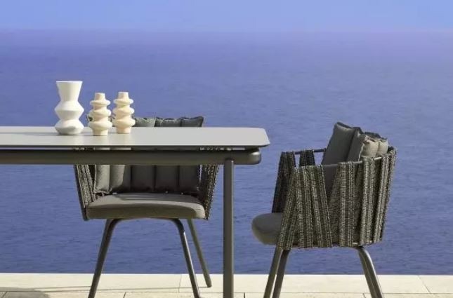 Silla Anthea de Resol, fabricada con estructura de aluminio lacado, cojines y tapizados aptos para exterior.