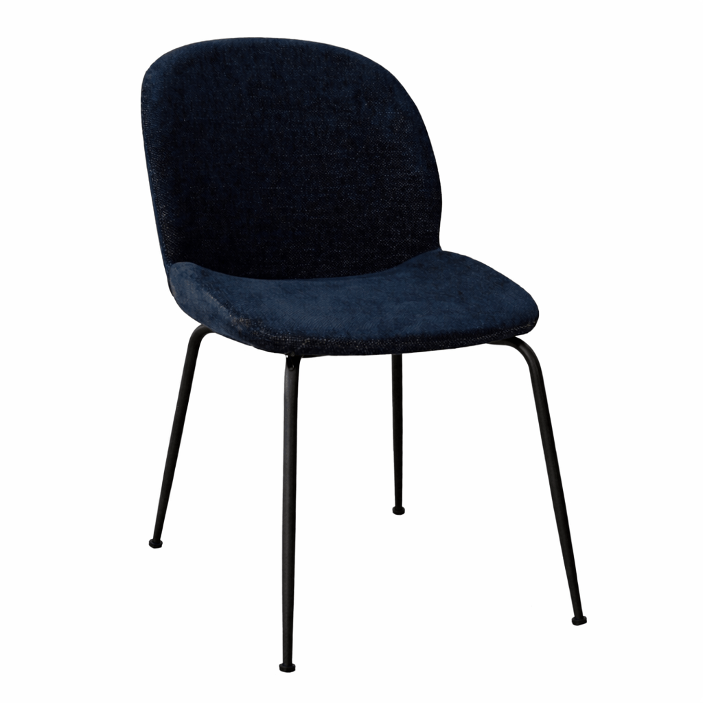 Silla Art deco tapizada 100% en poliéster en azul y patas en acero negro.
