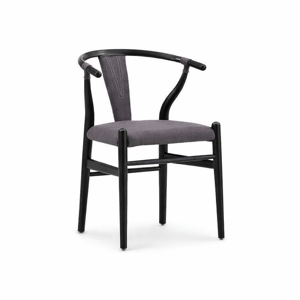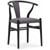 Silla Astrid con estructura en madera de fresno color negro, asiento y respaldo tapizado en color gris oscuro con tratamiento ” aqua clean” antimanchas.