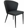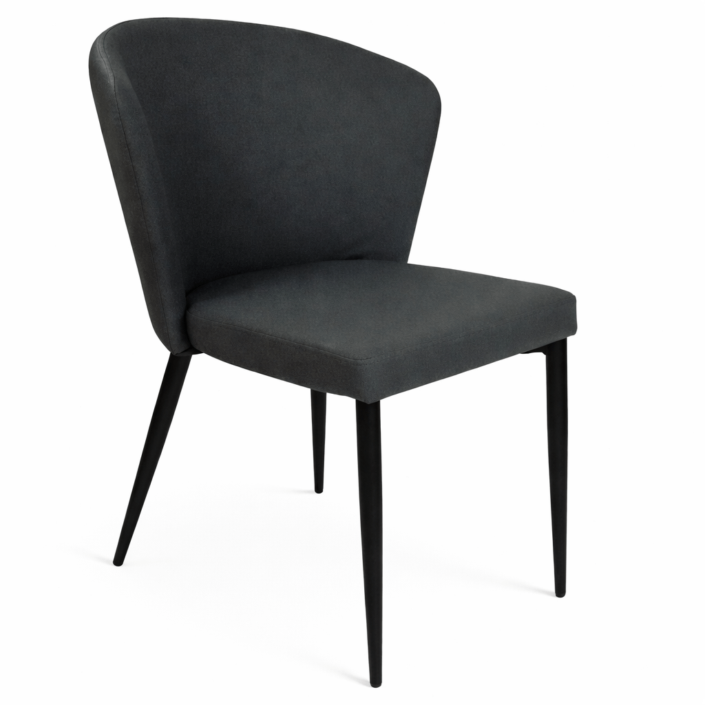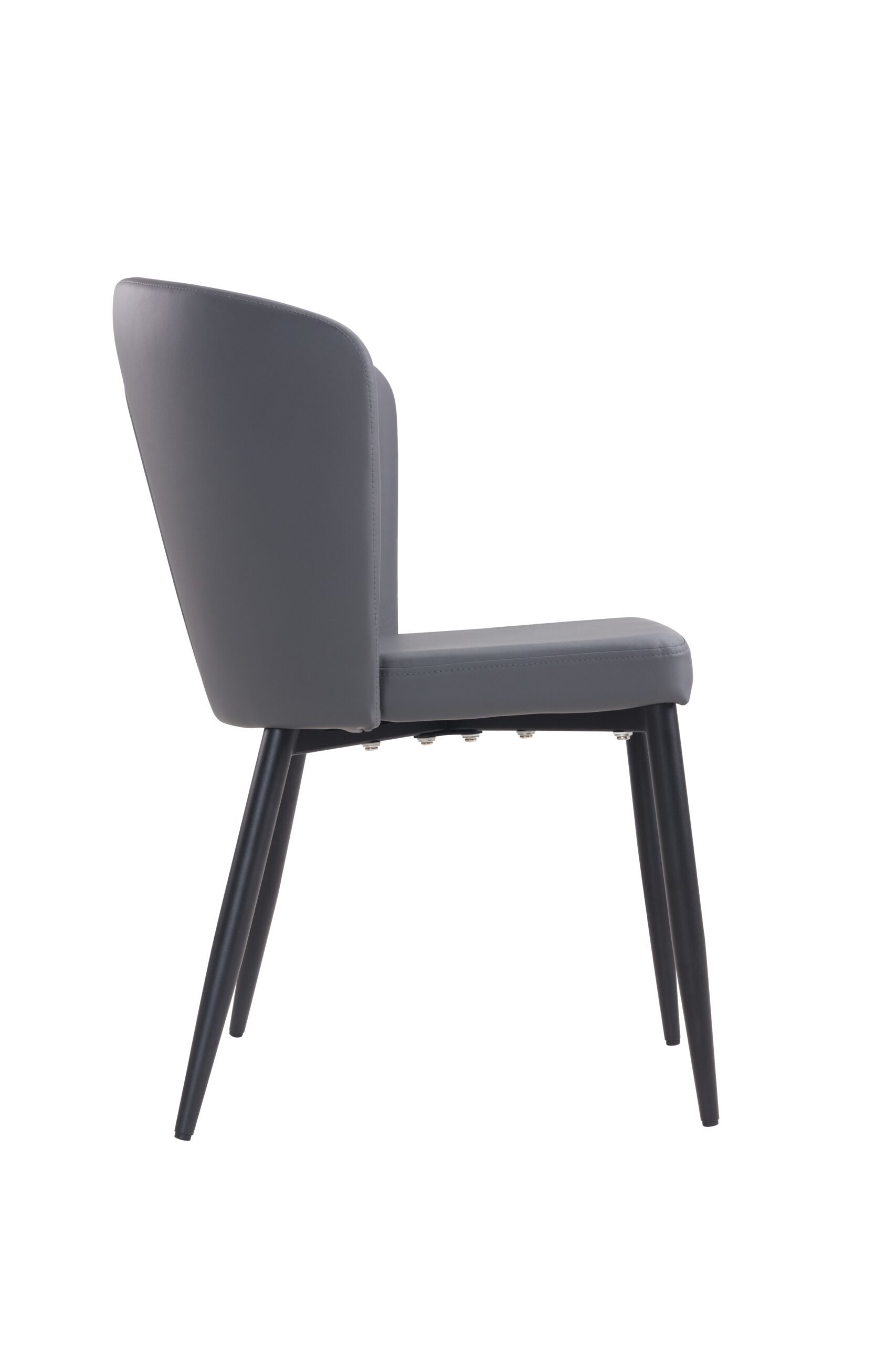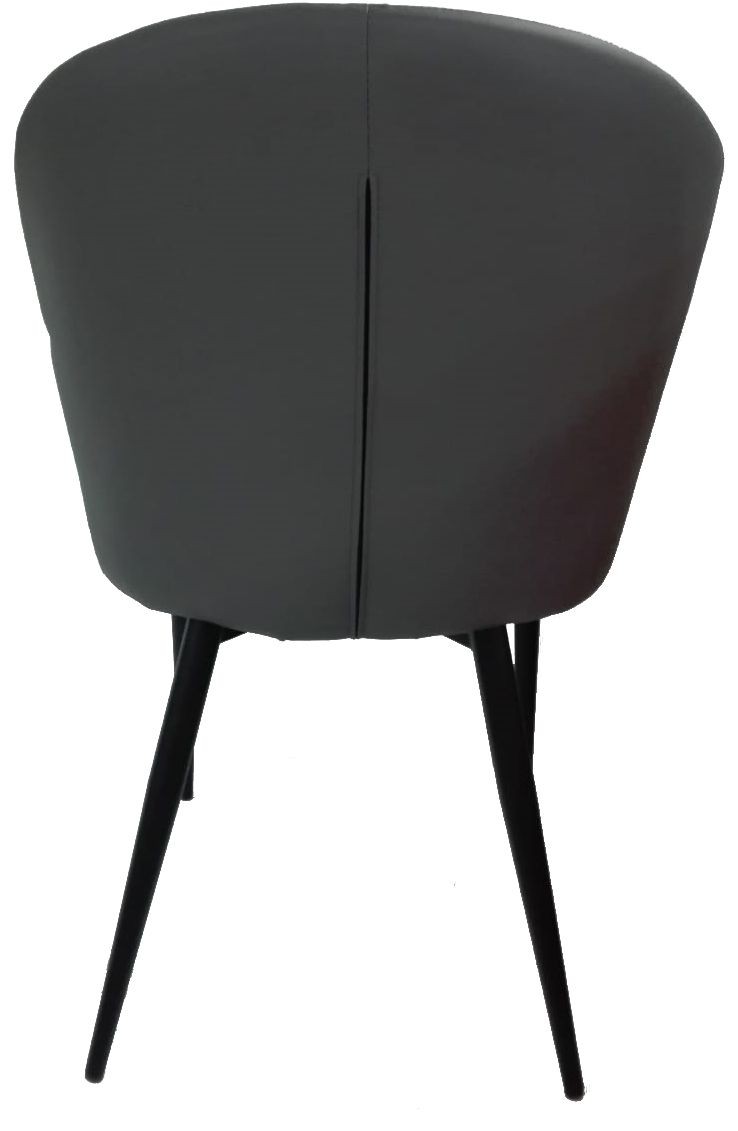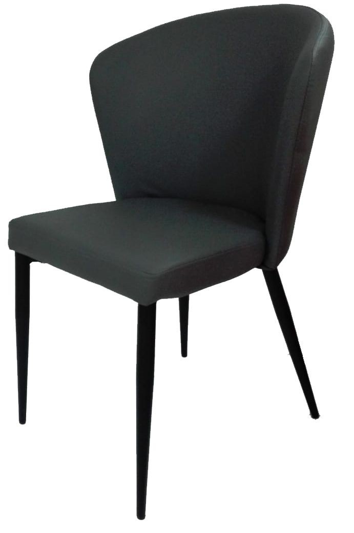 Silla fabricada asiento y respaldo en símil piel gris y patas metálicas negras.