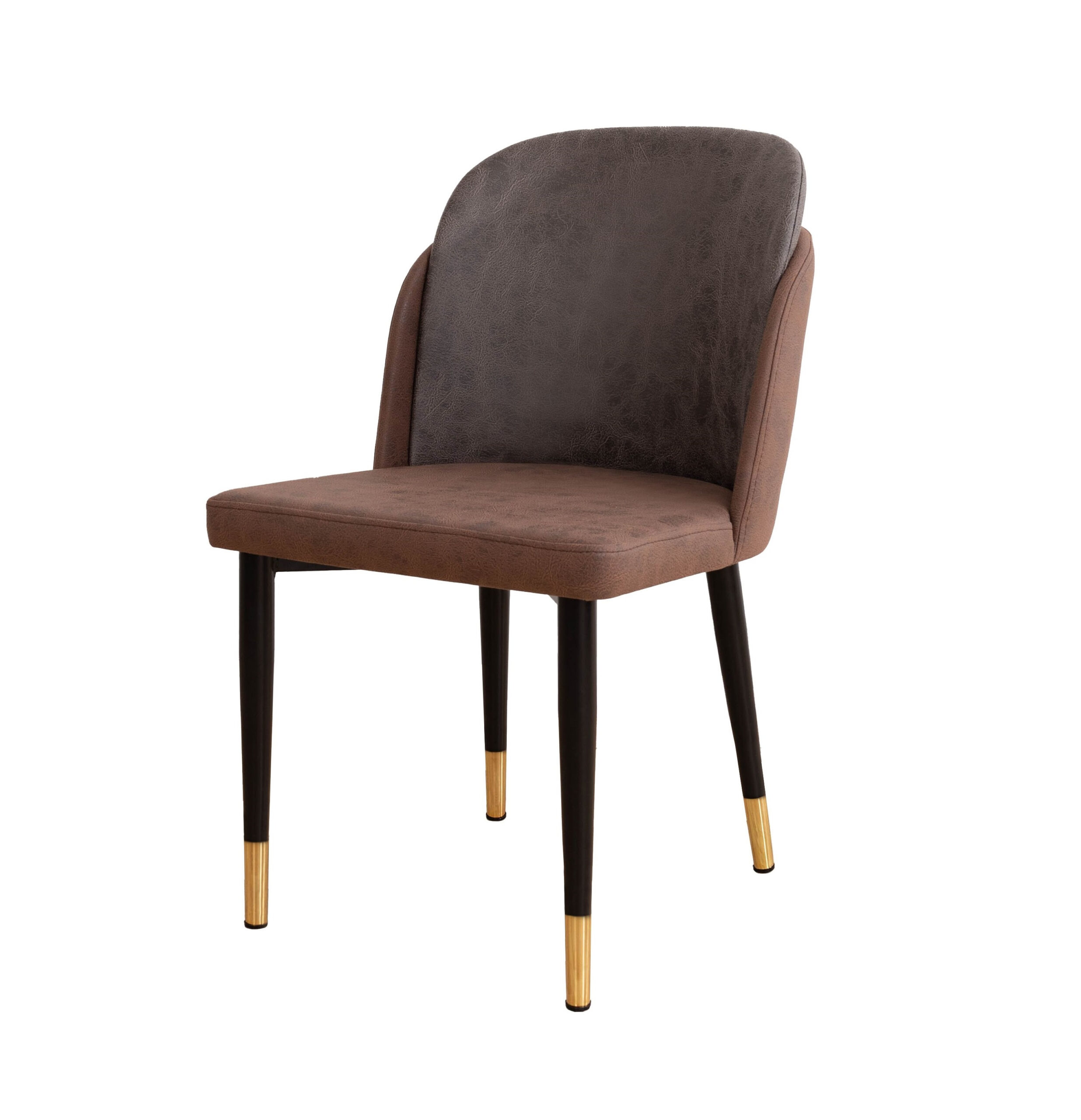 Silla Bergen tapizada 100% en polipiel marrón y gris y patas cónicas en acero negro y taco dorado.
