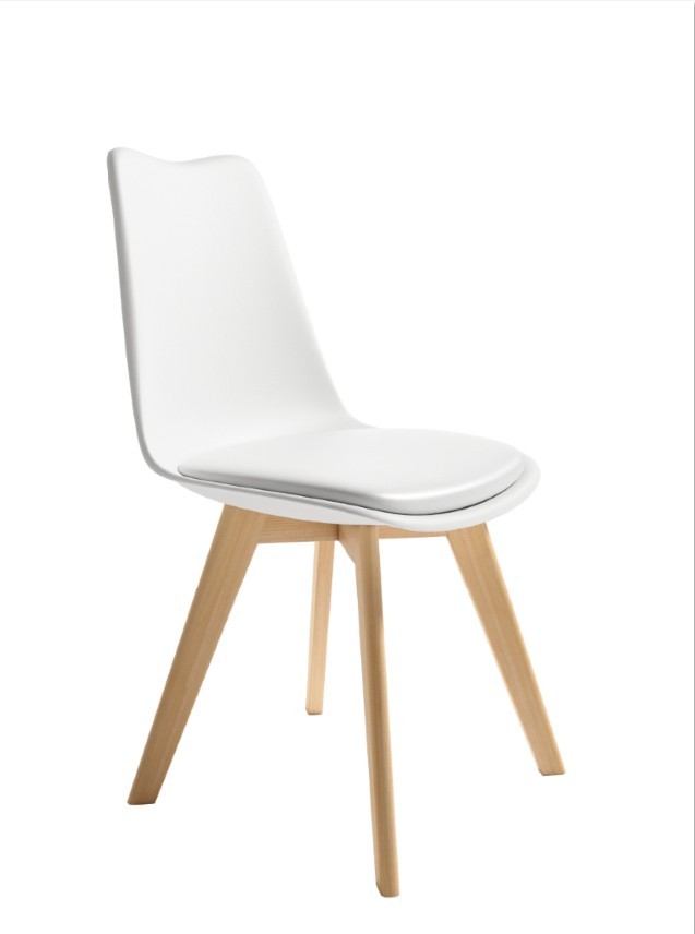 Silla Berlin en polipropileno blanco, asiento tapizado en polipiel blanca y patas en madera maciza.