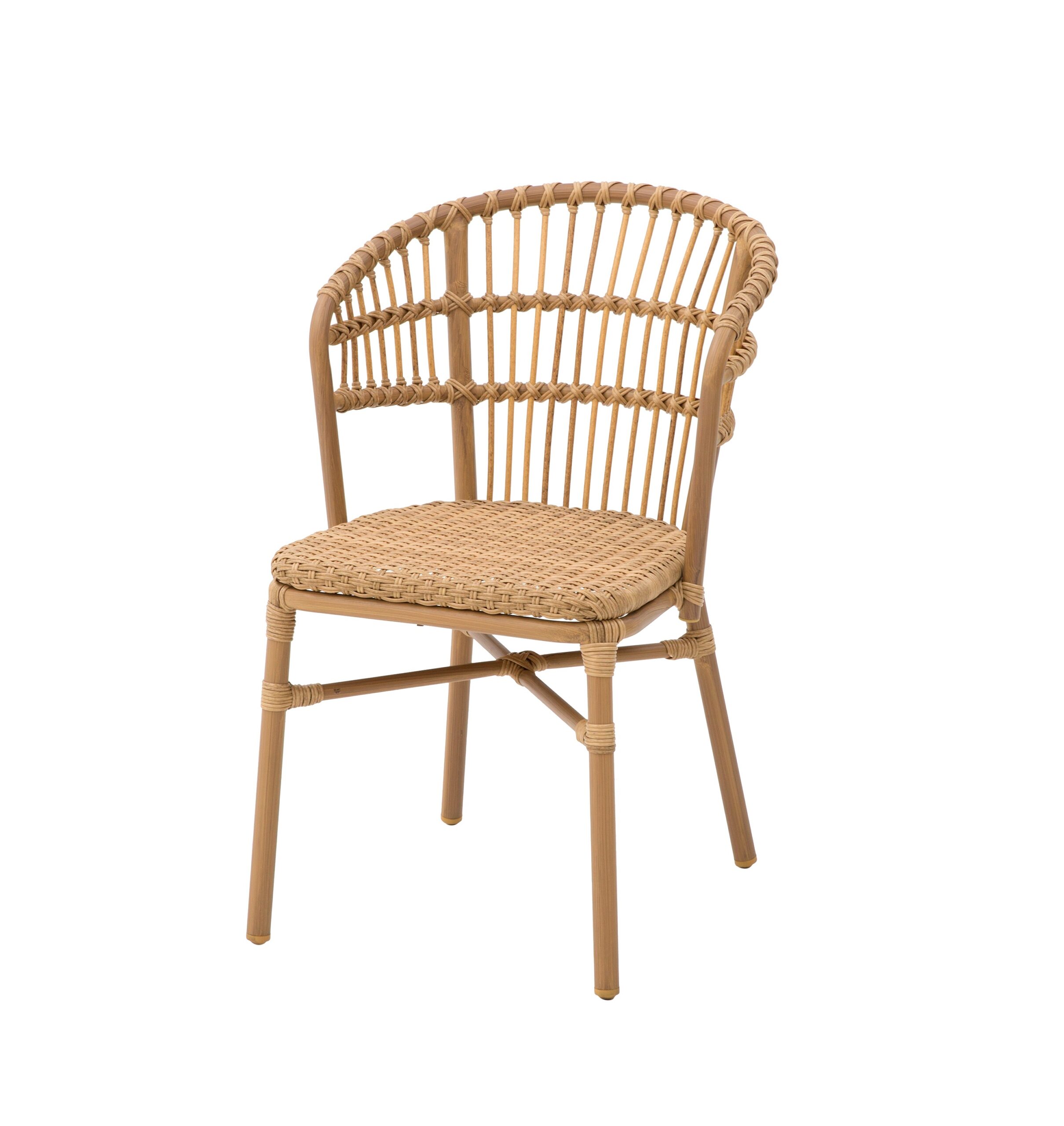 La silla Brandon fabricado con estructura de aluminio color natural, asiento y respaldo en rattan, es ideal para establecimientos que quieran dar un toque natural y elegante.