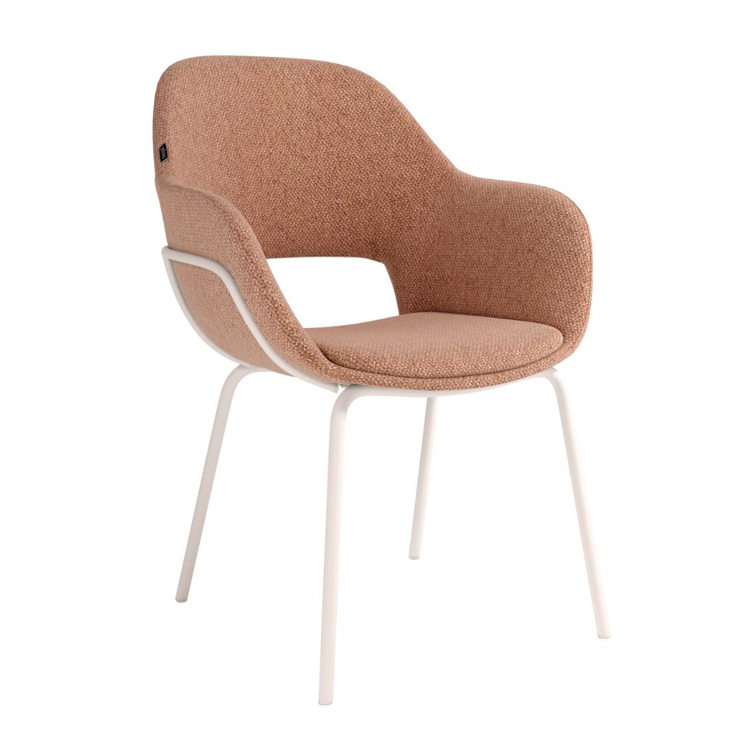 Silla Brisbane color salmón, respaldo y asiento tapizado y patas metálicas a juego.